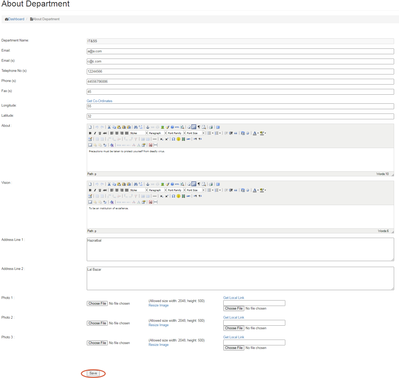 In this section, user can update the details of their department Page by editing the section and saving the details.
